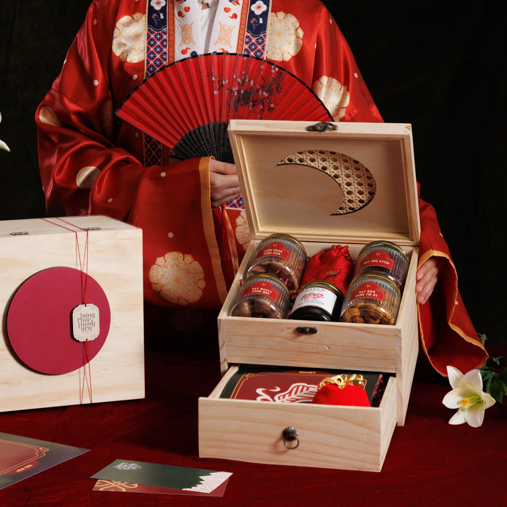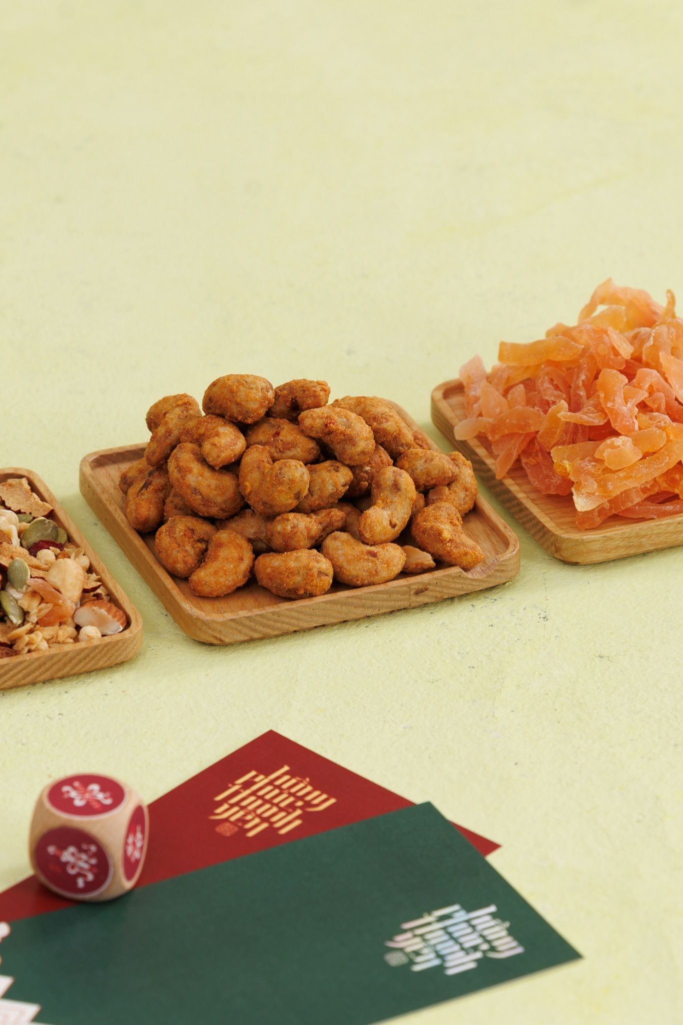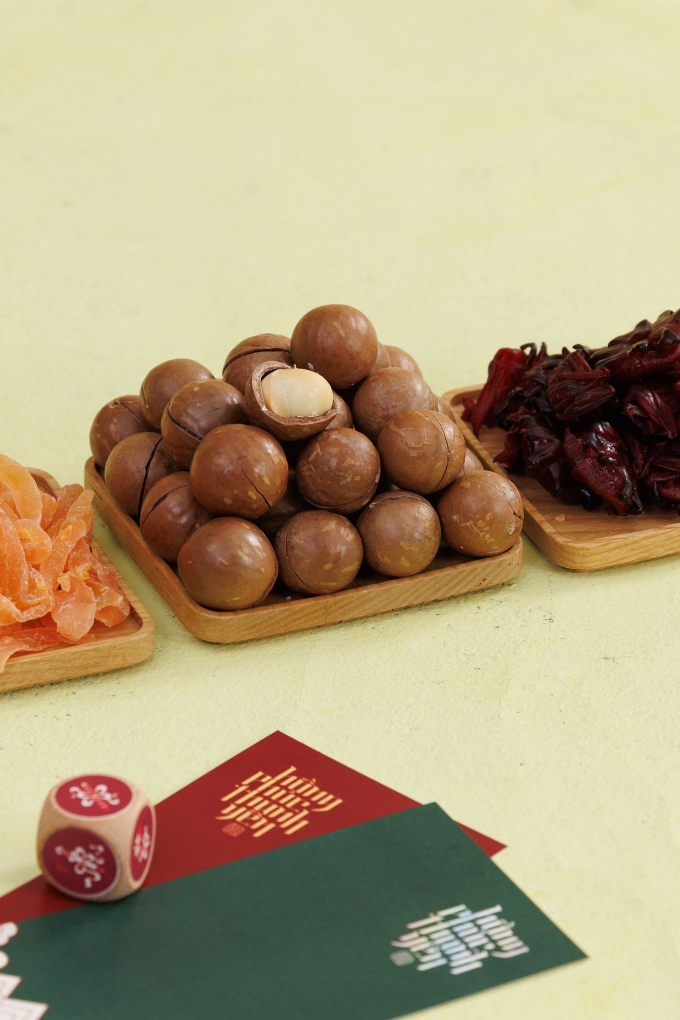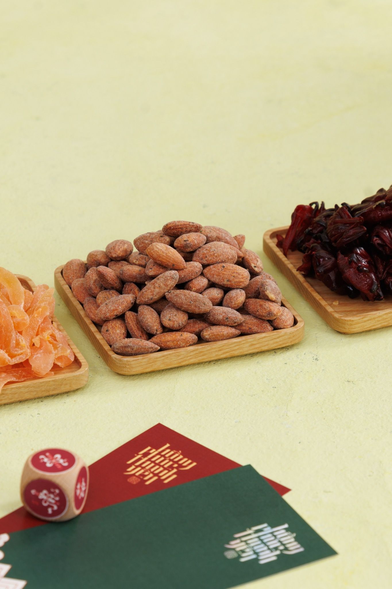- Tầng trên: 1 Hạt Macca rang mộc + 1 Mứt hoa Atiso + 1 Hạt điều rang tỏi ớt + 1 Hạnh nhân rong biển + 1 mật ong hoa + 1 túi thơm may mắn