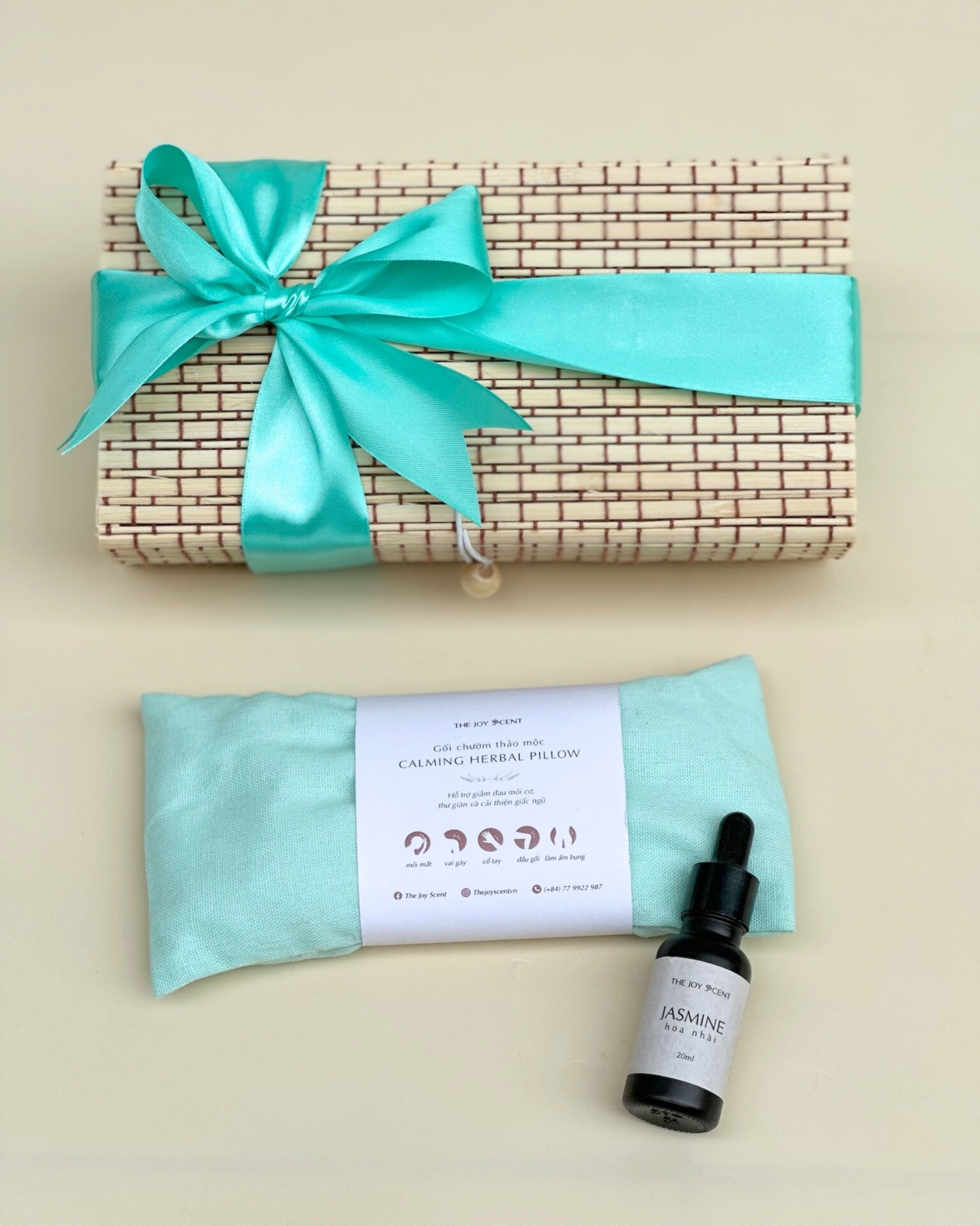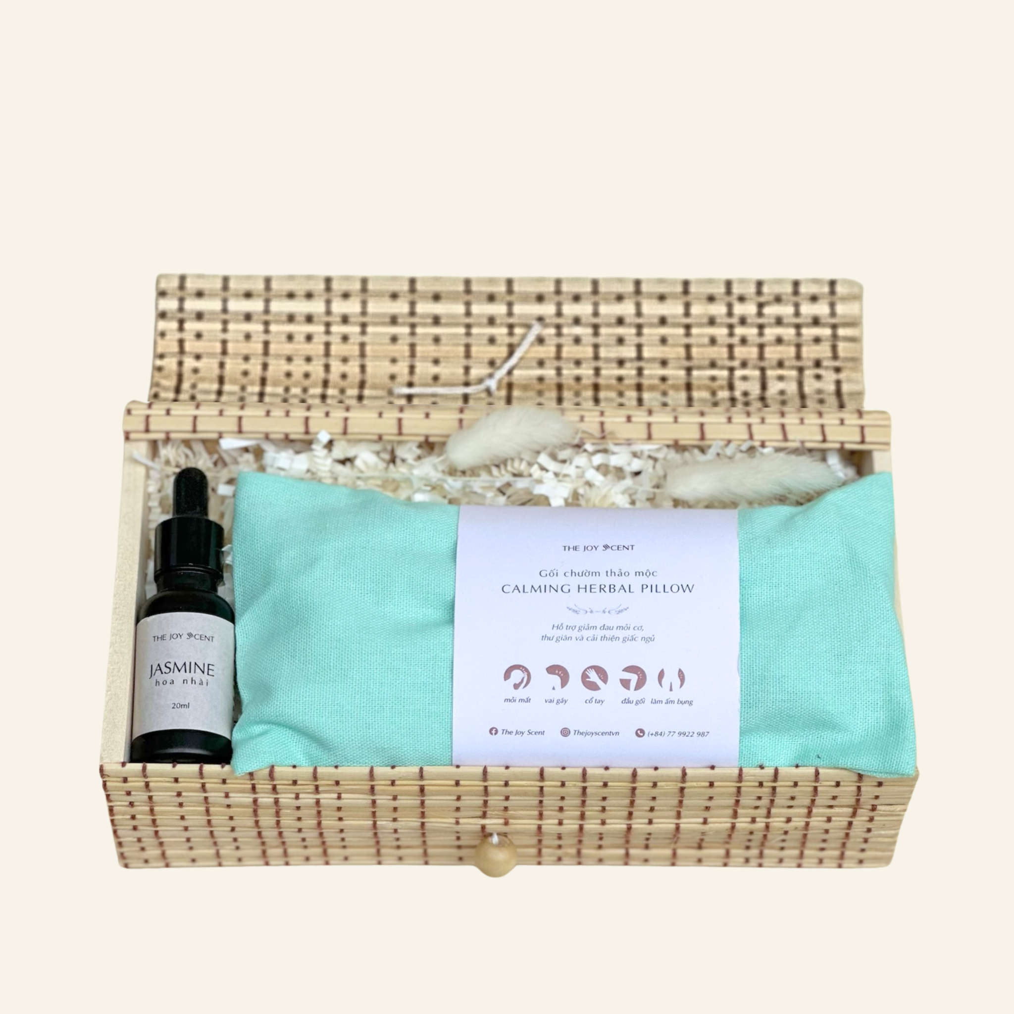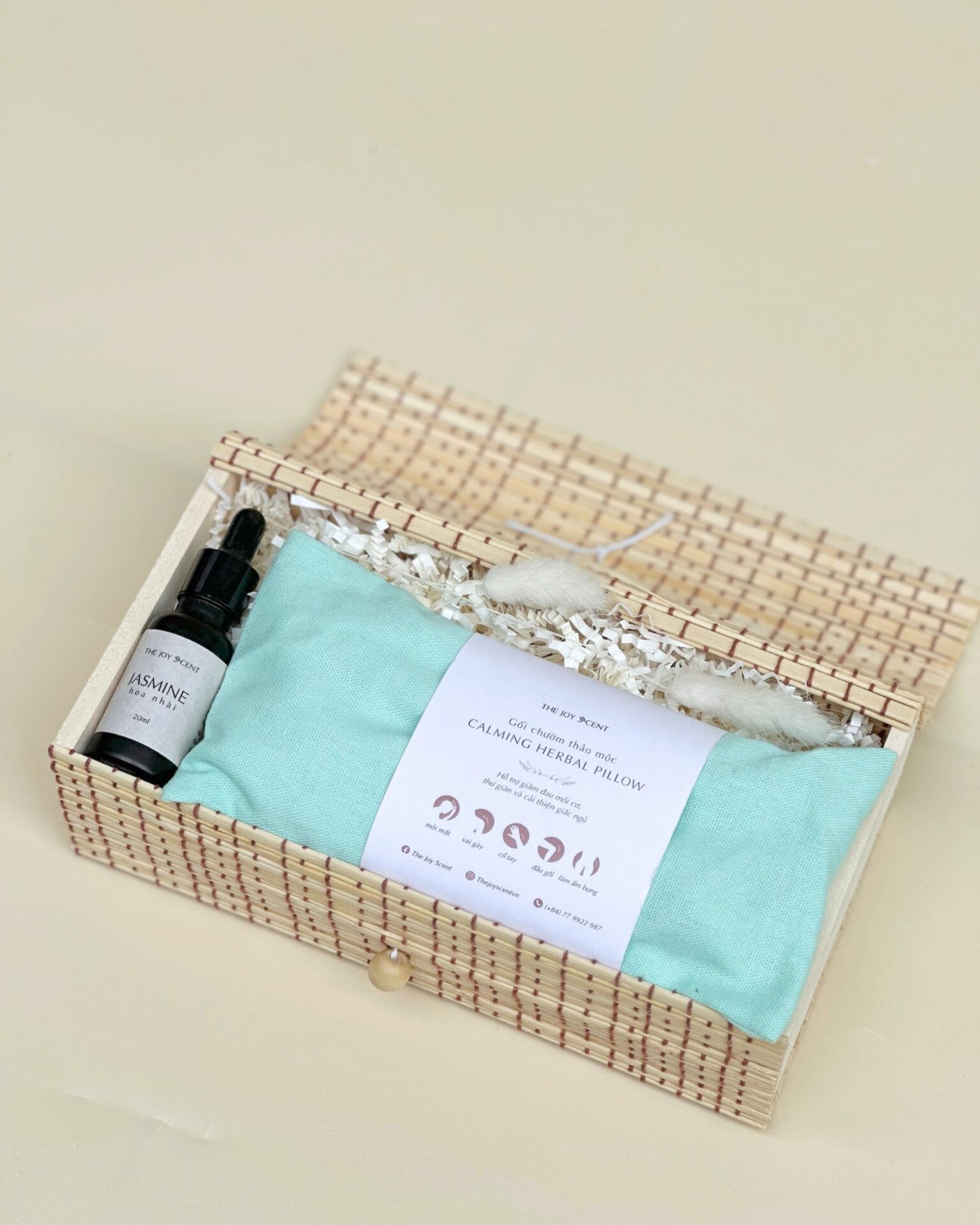 Tất cả được gói ghém trong hộp mây đan nơ trang trí, tặng kèm thiệp 20.11, có thể tái sử dụng làm hộp đựng đồ cá nhân.