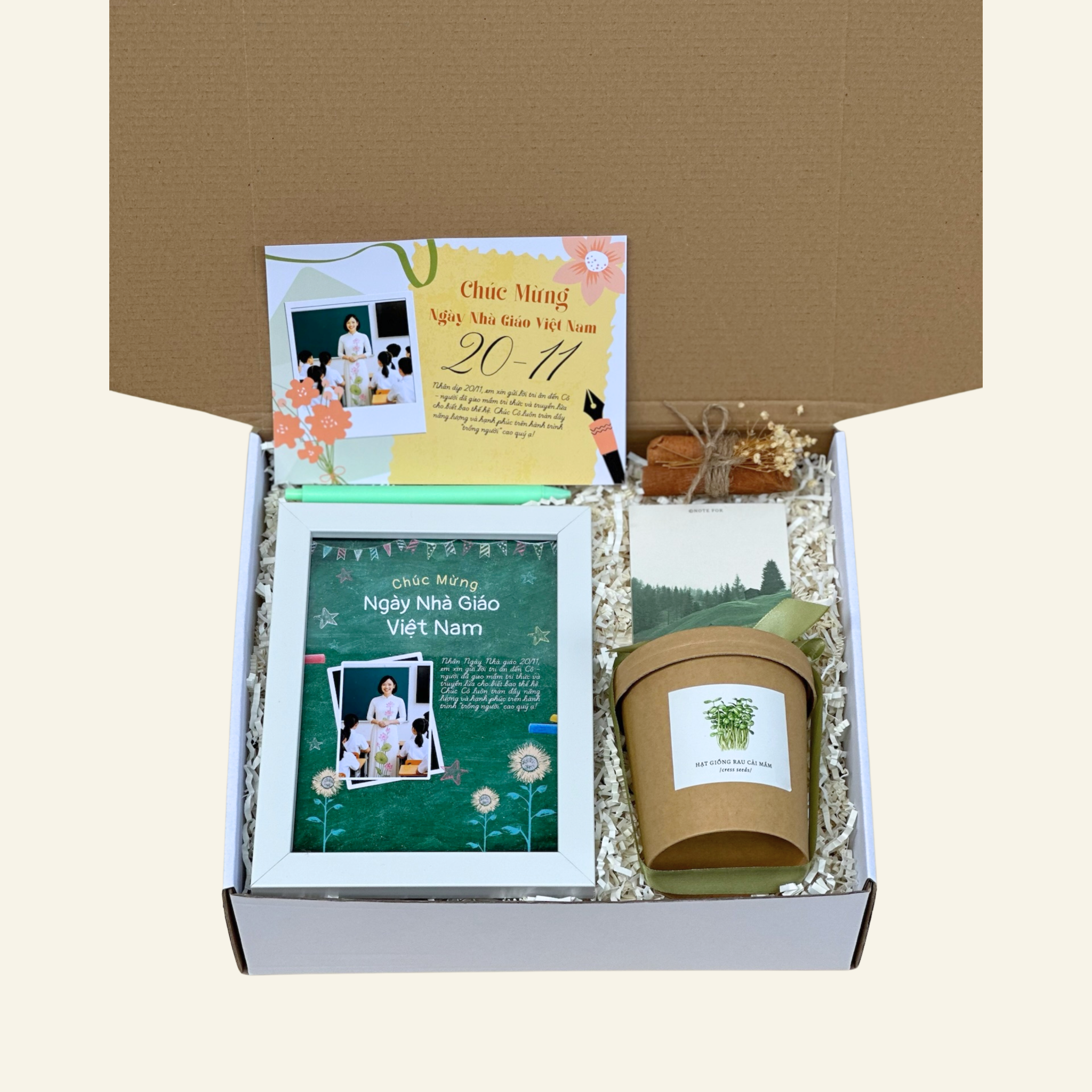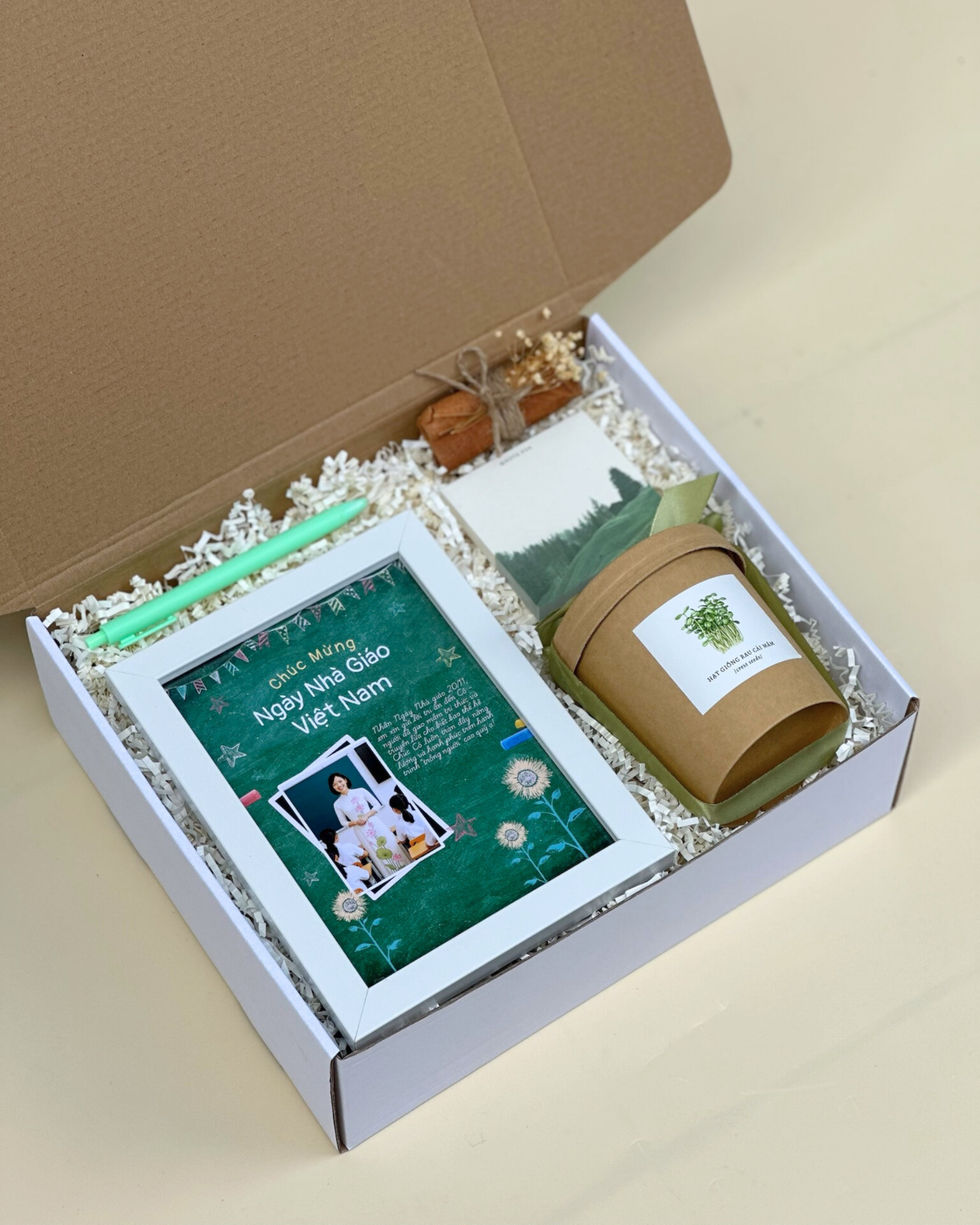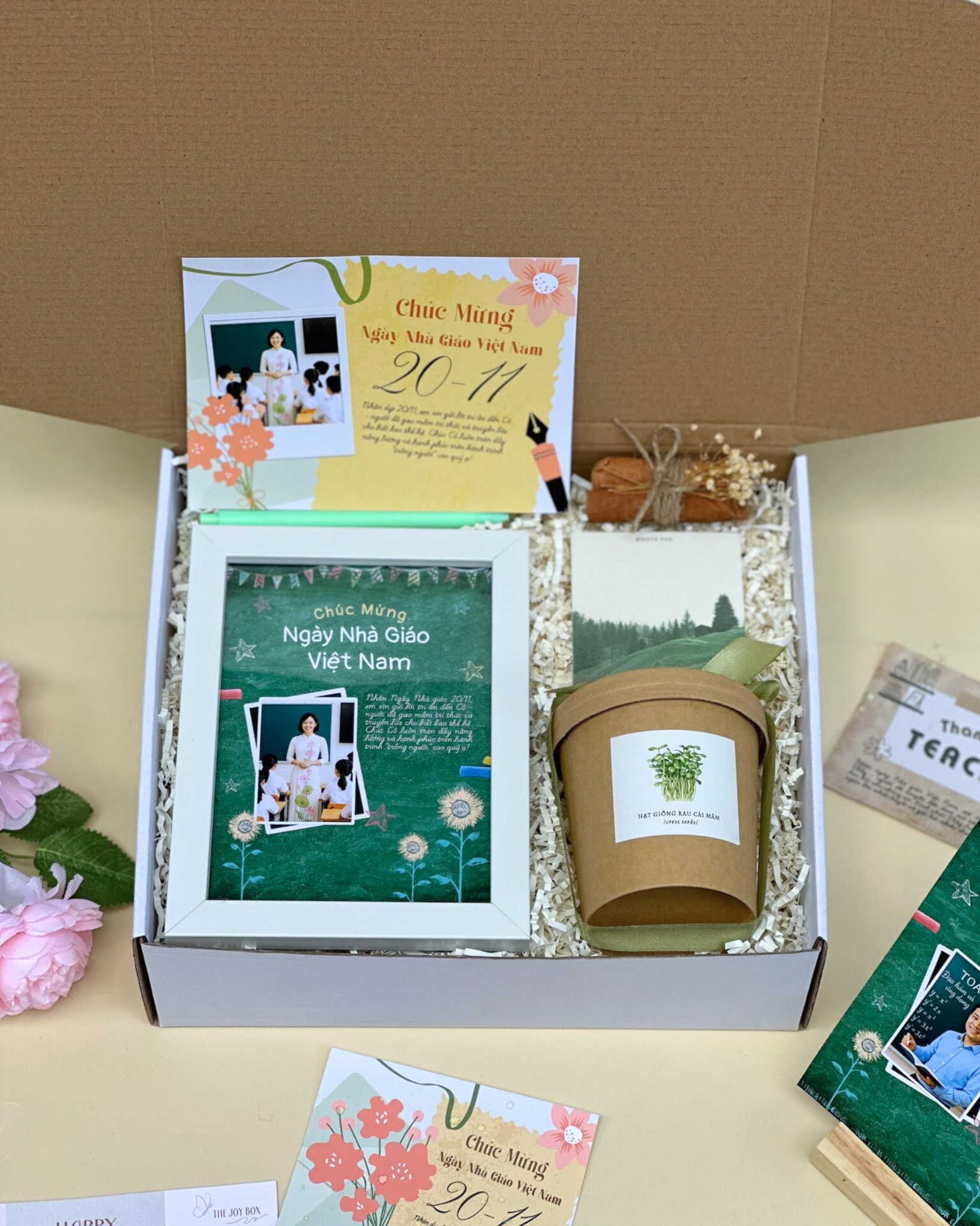 Gieo Mầm là set quà được The Joy Box tạo nên với cảm hứng từ hình ảnh người thầy - “người gieo hạt” của tri thức và niềm tin. Mỗi món nhỏ trong hộp quà là biểu tượng cho lòng biết ơn gửi đến những người đã không ngừng gieo tri thức, vun đắp thế hệ mai sau.