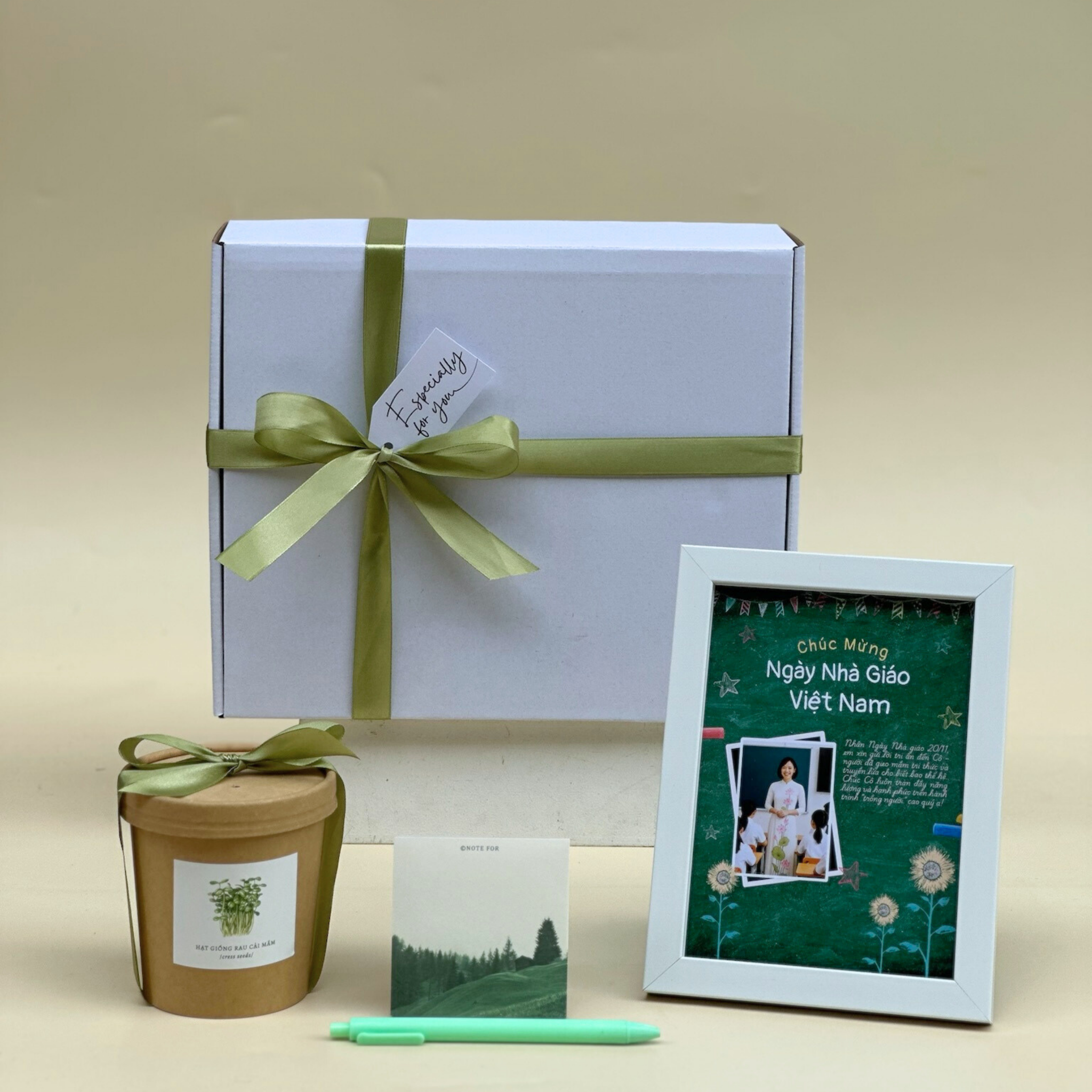 Tất cả được gói ghém trong hộp carton trắng phối nơ xanh olive - sang trọng, chỉn chu và thân thiện với môi trường.