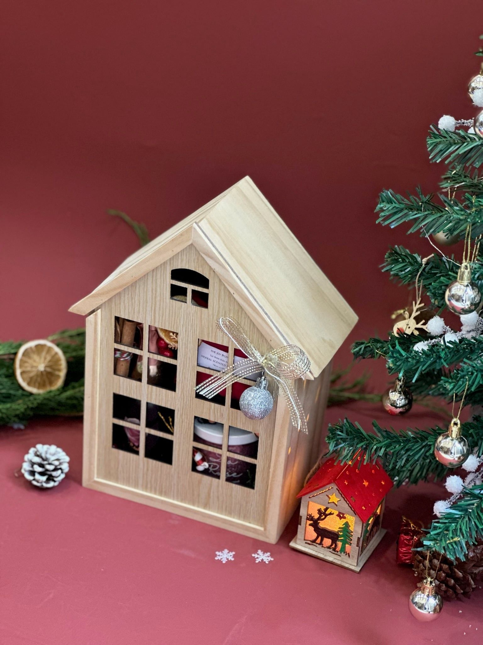 🎁 Hộp gỗ ngôi nhà nghệ thuật: Thiết kế ấm áp như hình ngôi nhà mùa đông, tô đậm sắc Giáng Sinh khi mở hộp quà.