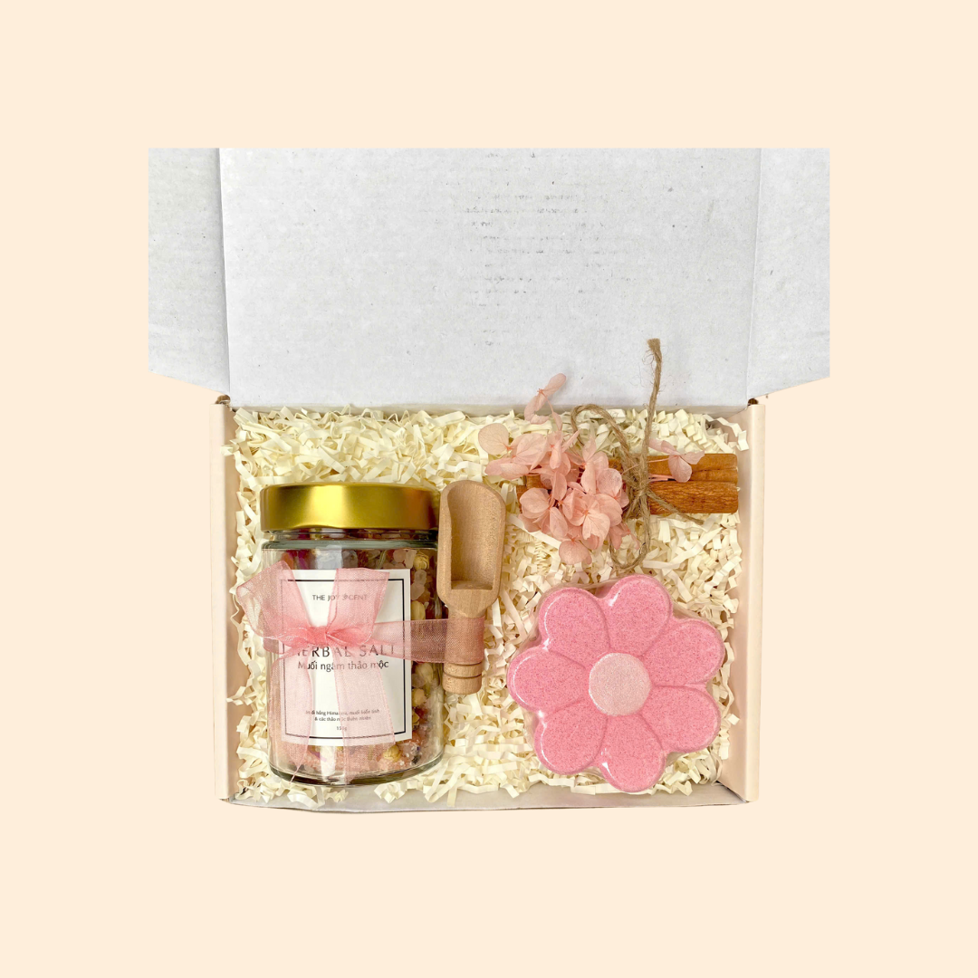 - Muối ngâm thảo mộc: Muối epsom, muối hồng Himalaya hạt, muối hồng Himalaya nhuyễn, các loại thảo mộc thiên nhiên (cánh hoa hồng, hoa lài, lavender, hương thảo, lát cam bẻ nhỏ)