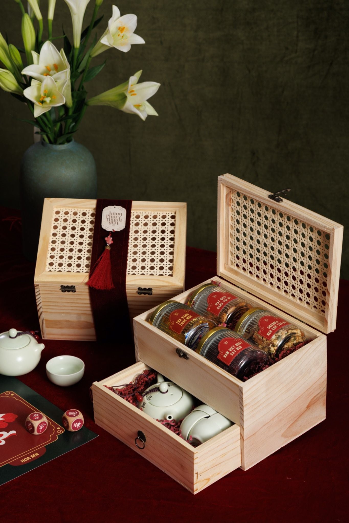 - Hộp gỗ thông 2 tầng, nắp đan nan mây