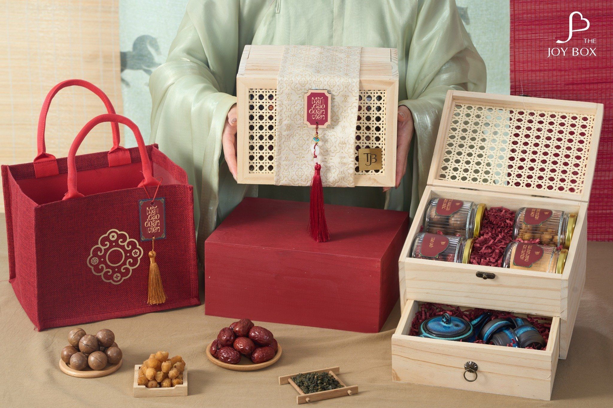 - 3 lọ hạt/mứt cao cấp: Long nhãn ôm sen, Táo đỏ sấy, Hạt macca