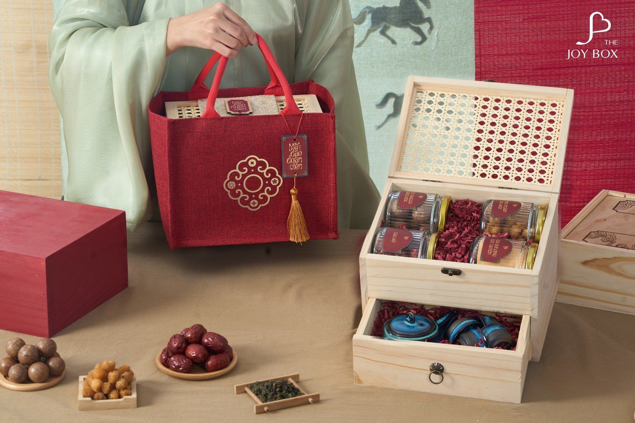 Biểu tượng cho hành trình mới đầy khởi sắc, Mã Đáo Khởi Niên với thiết kế hộp gỗ hai tầng cao cấp cùng chất liệu mây đan và vải gấm vàng ánh kim tạo nên cảm giác sang trọng, bền vững – như lời chúc khởi đầu hanh thông, thịnh vượng và may mắn.