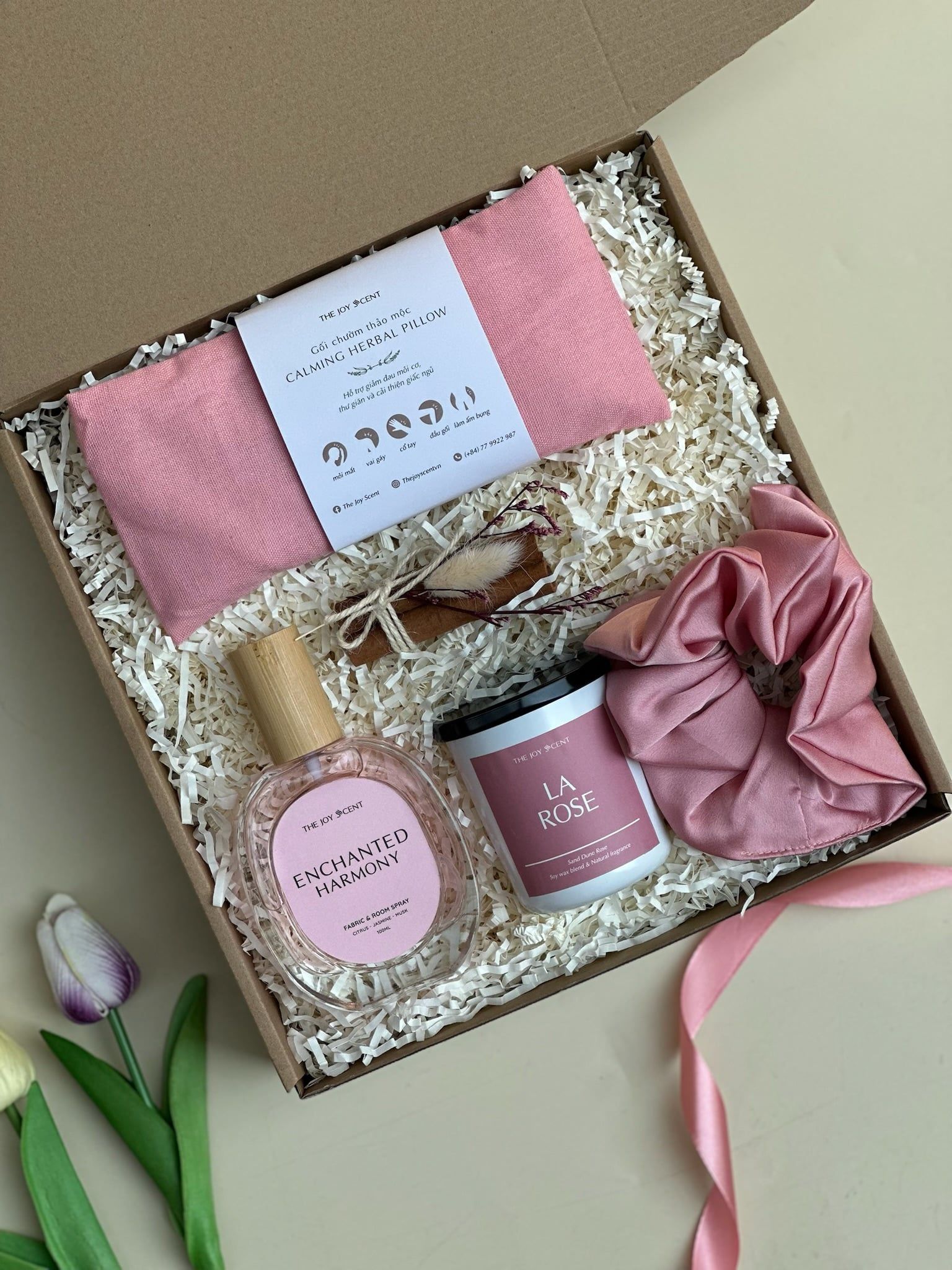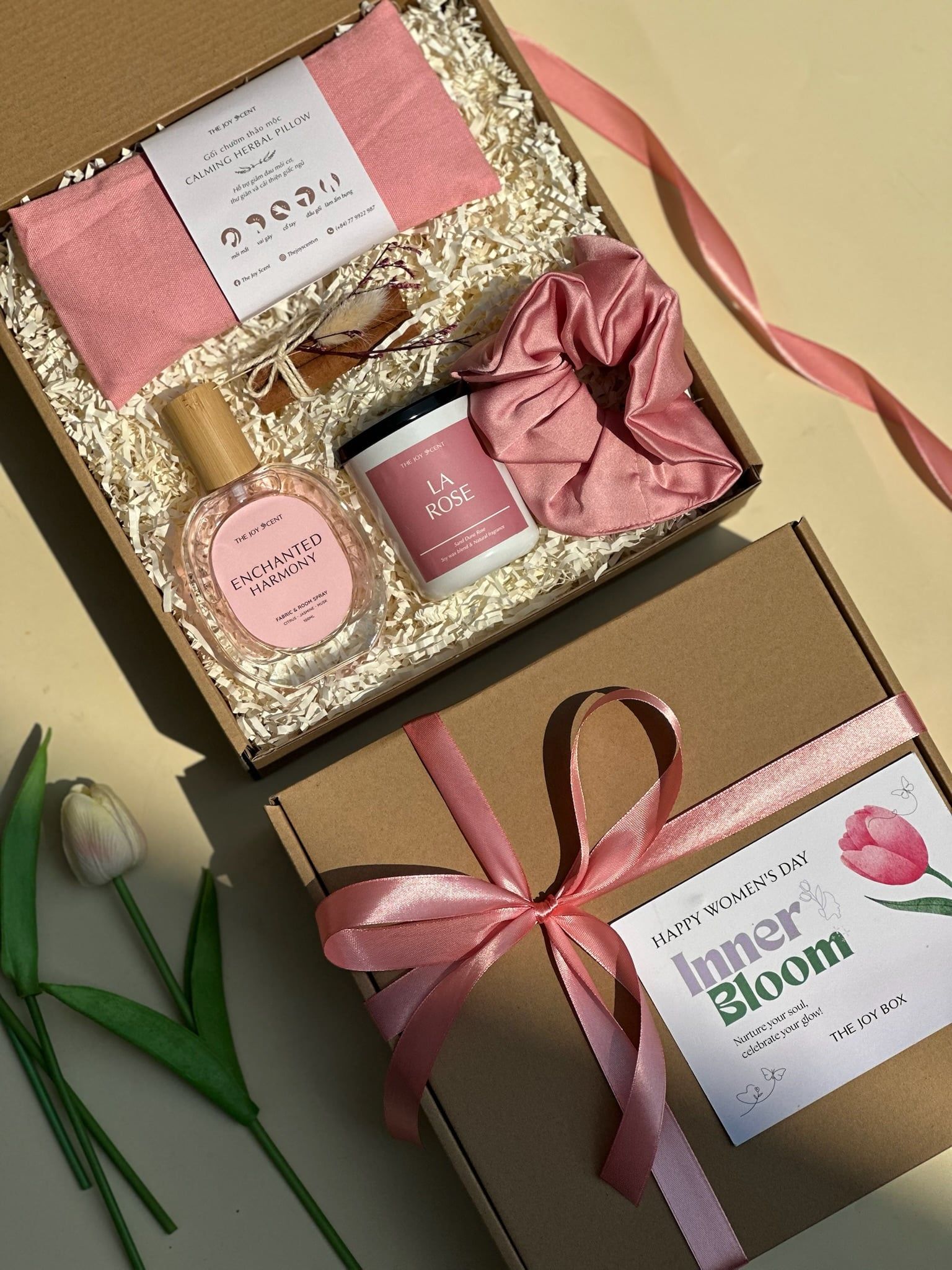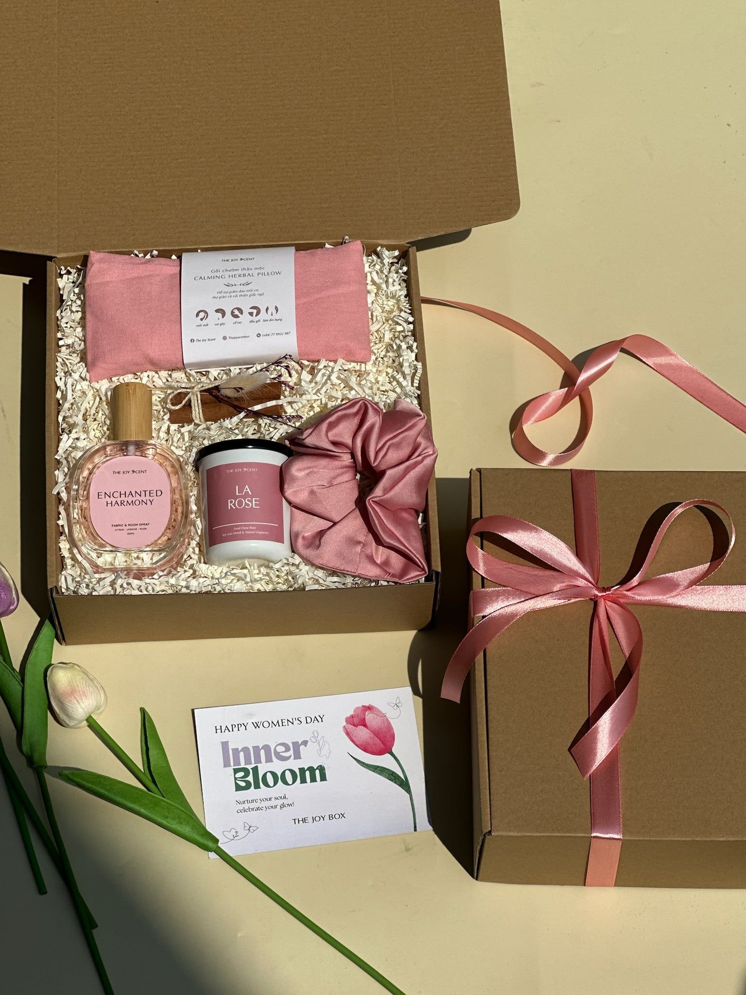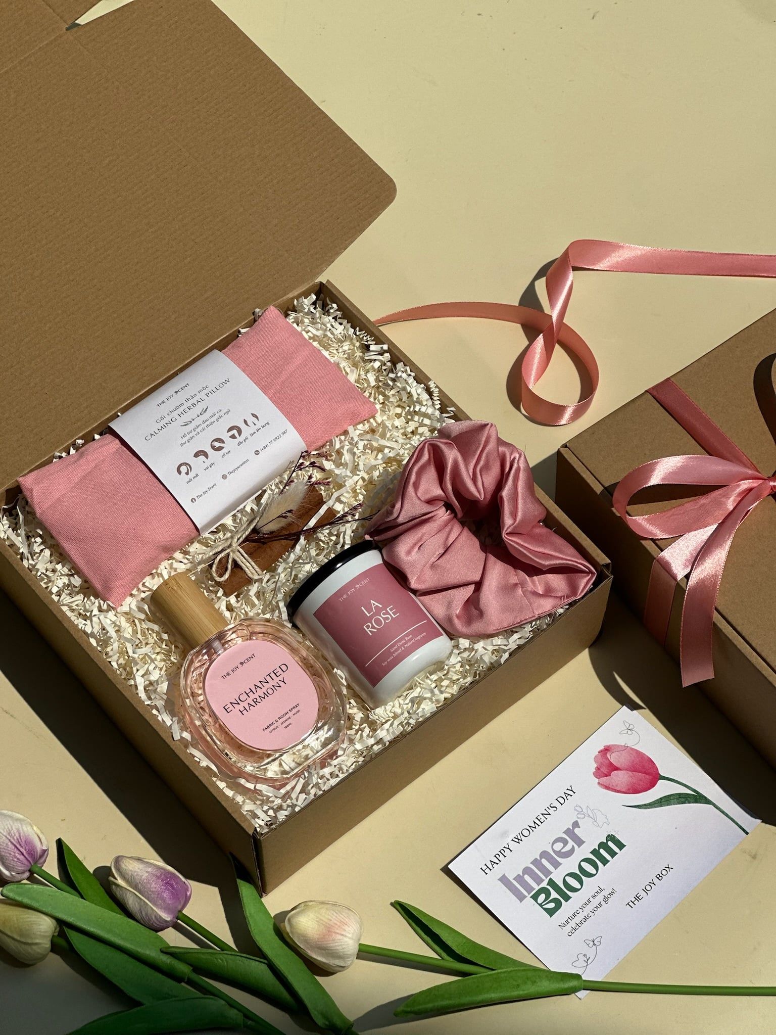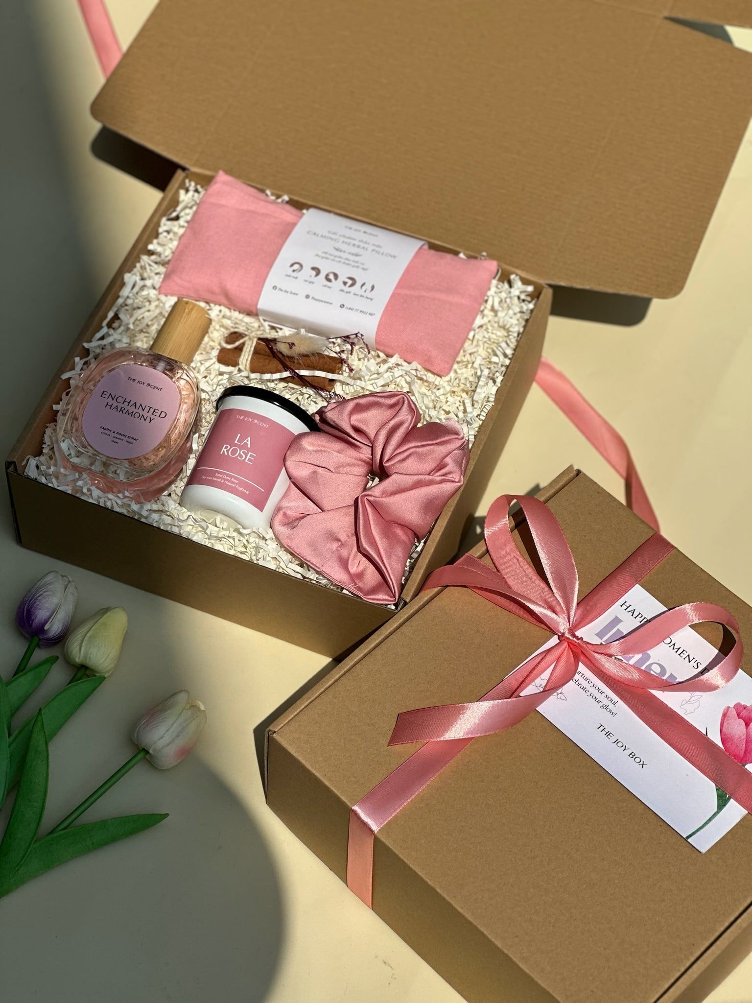 Trang trí: Hộp quà được thắt nơ xinh xắn, The Joy Box có hỗ trợ viết thiệp theo yêu cầu.
