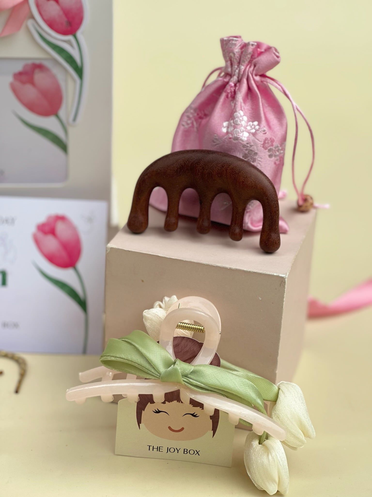 - Lược gỗ đàn hương massage đựng trong túi vải gấm hồng xinh xắn