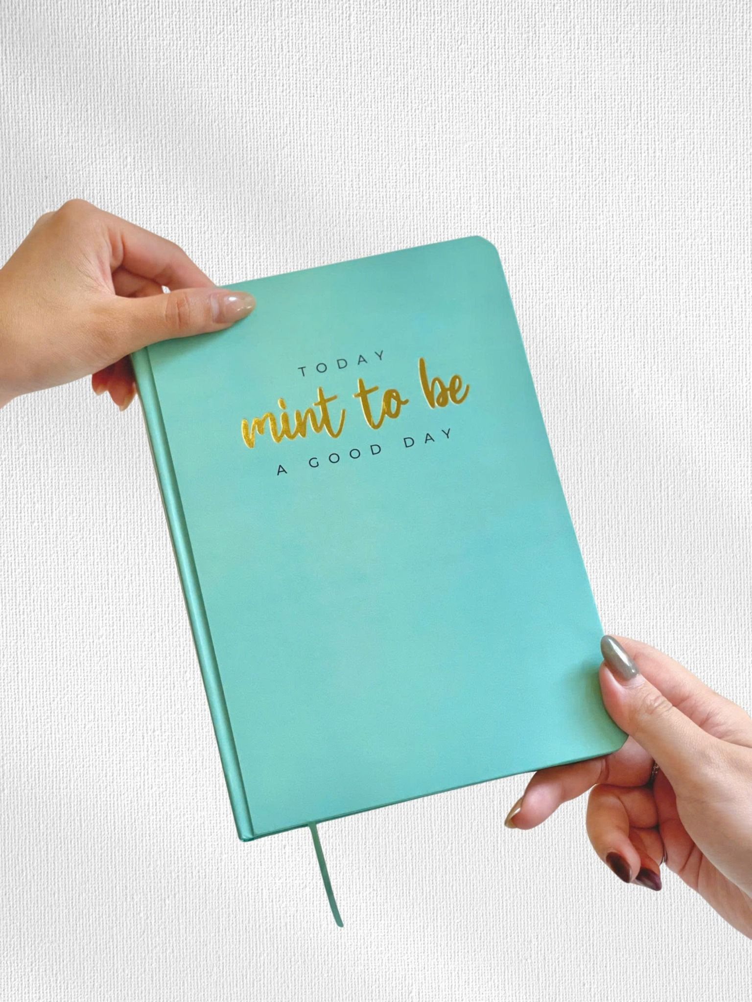 📘 Sổ bìa cứng màu xanh mint sang trọng, chữ dập nhũ vàng "mint to be" tinh tế