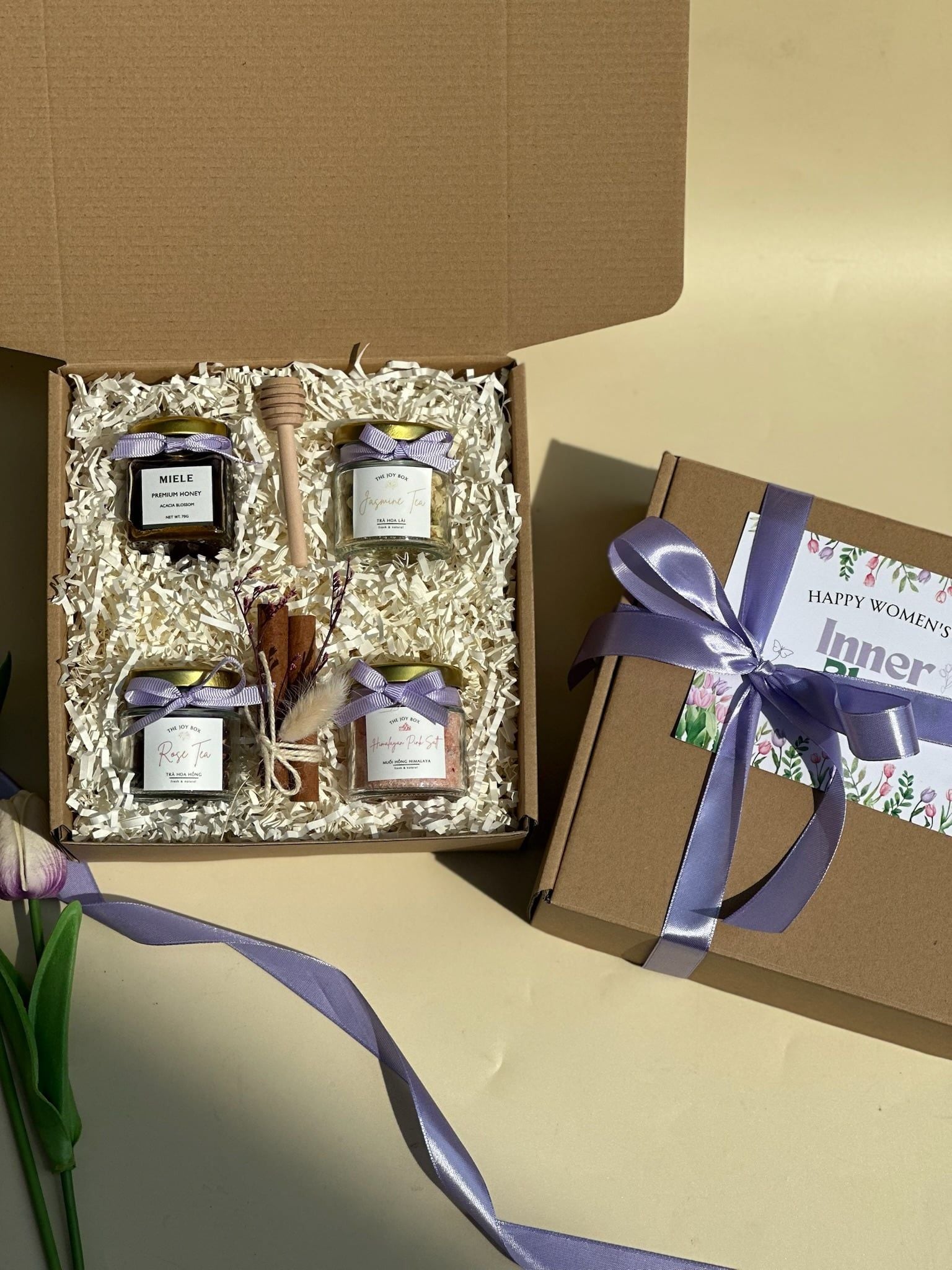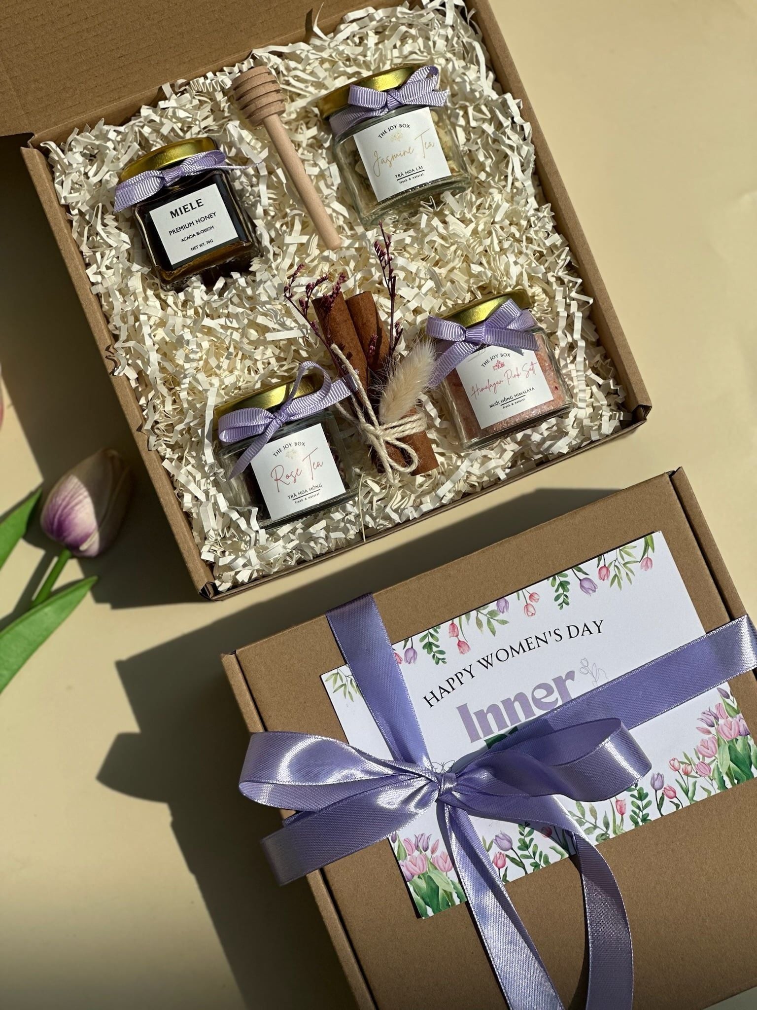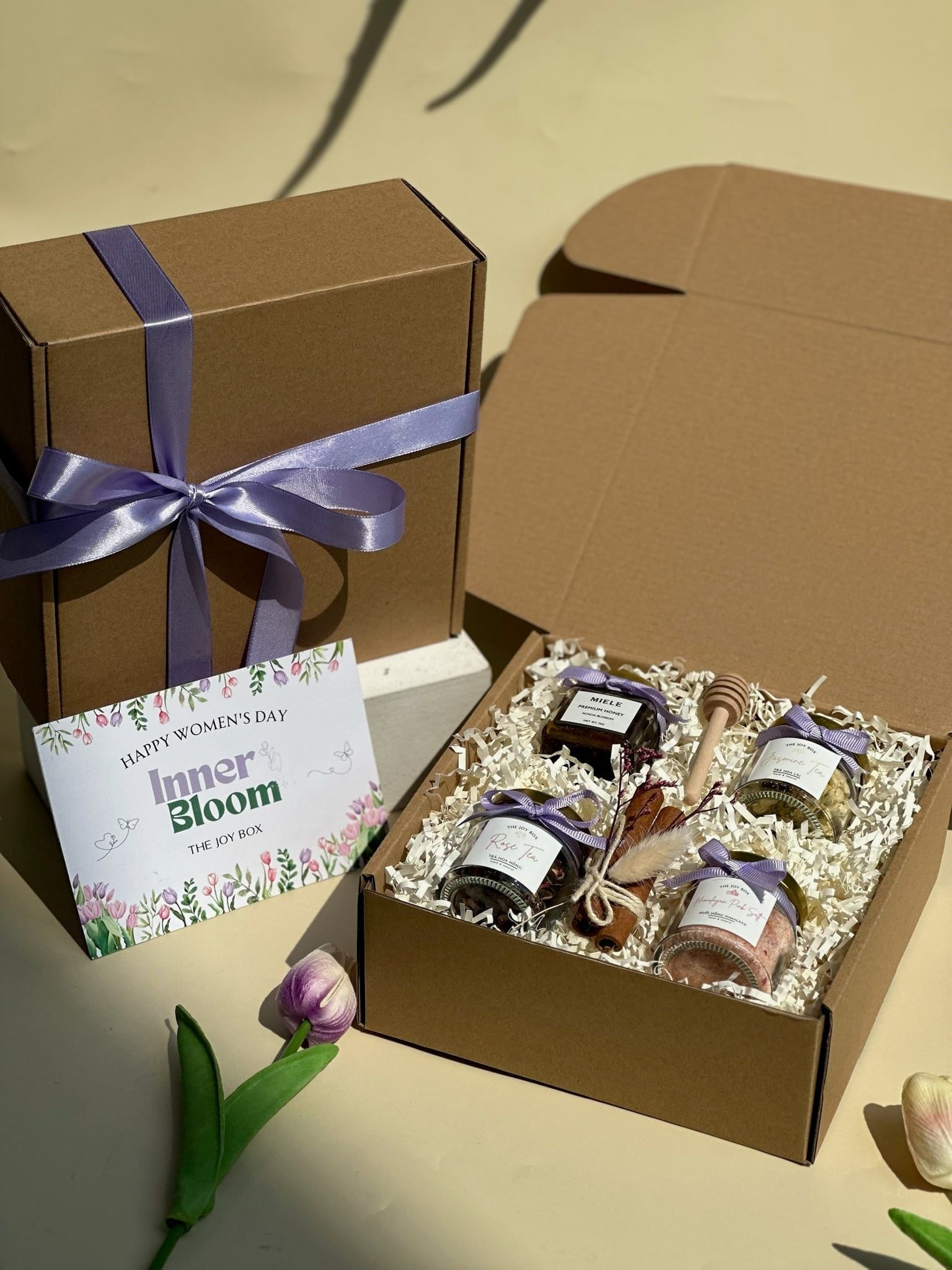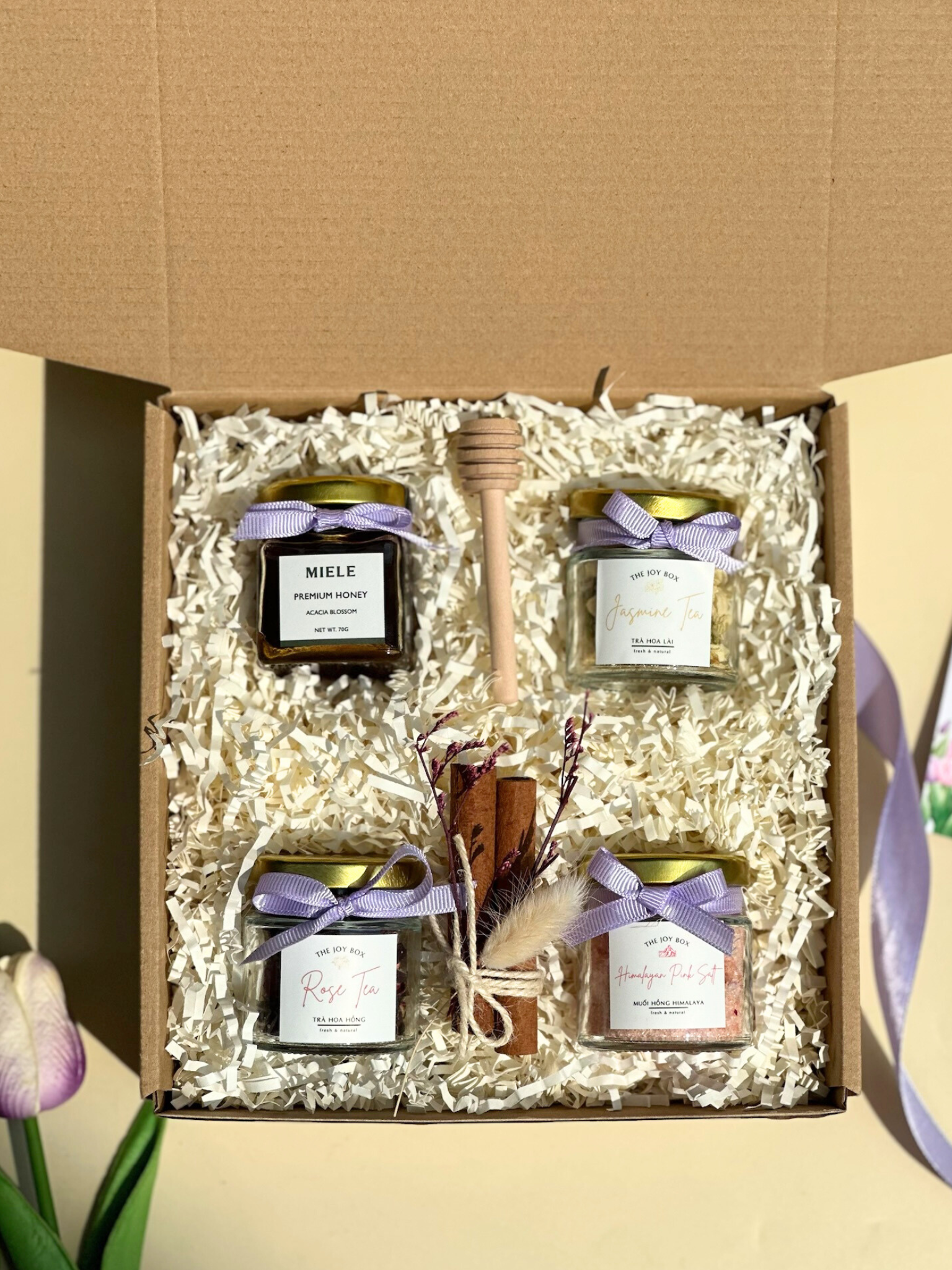 Trang trí: Hộp quà được thắt nơ xinh xắn, The Joy Box có hỗ trợ viết thiệp theo yêu cầu.