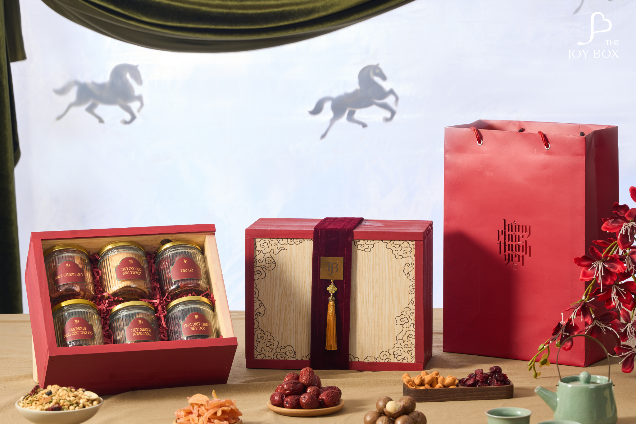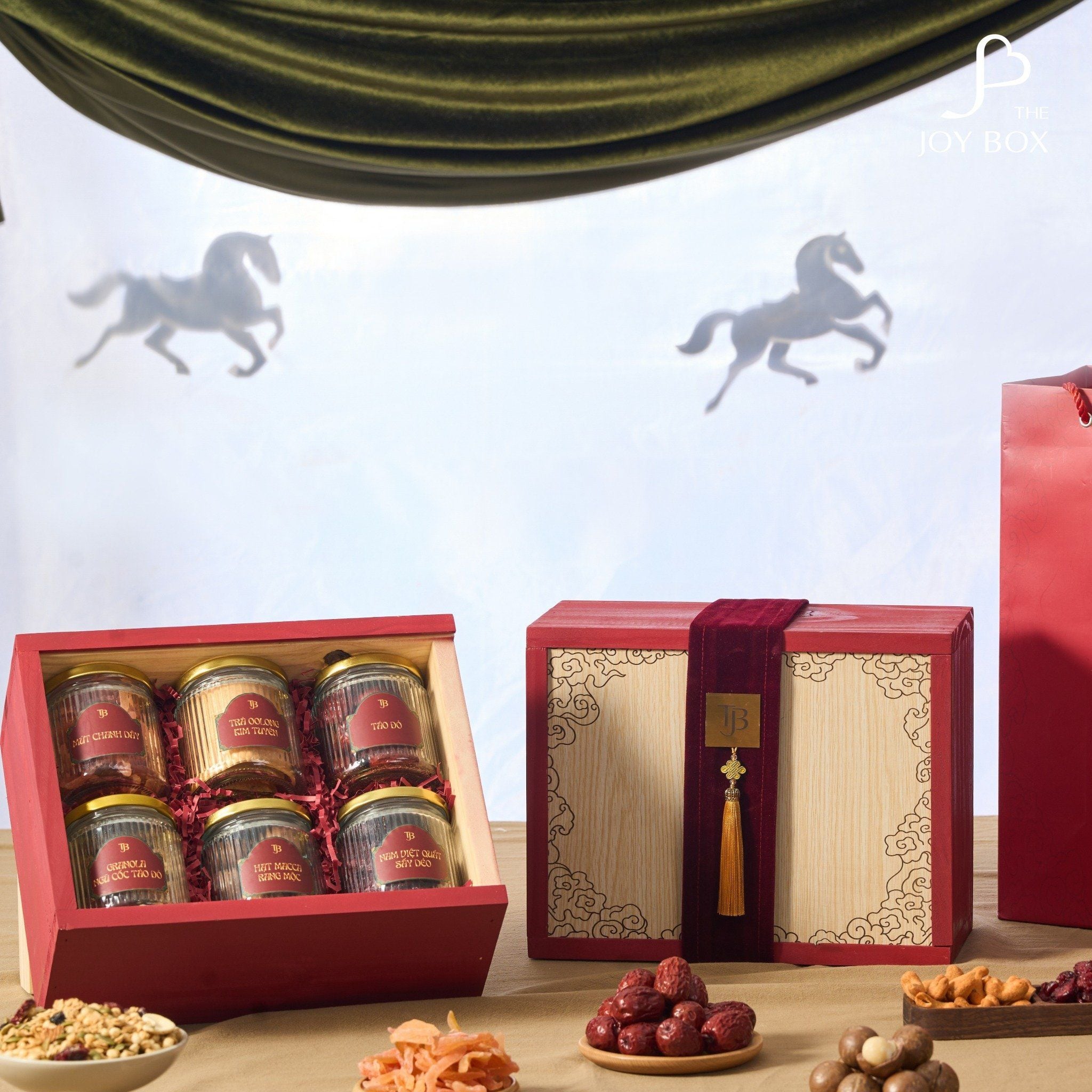 - 5 lọ hạt/mứt cao cấp: Táo đỏ sấy, Granola ngũ cốc, Nam việt quất sấy dẻo, Hạt macca, Mứt chanh dây